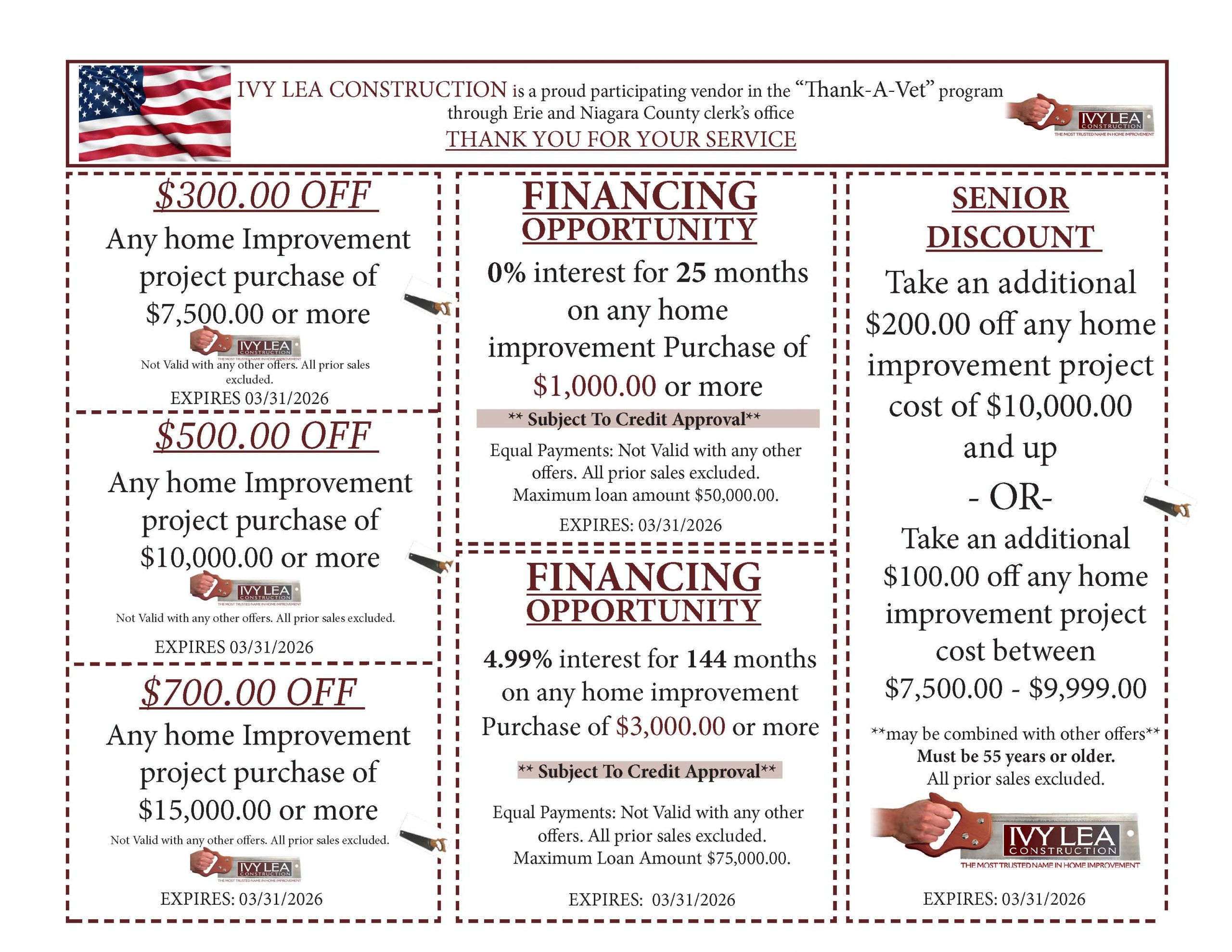 Being a homeowner has numerous benefits, but with those benefits comes great responsibility. For example, if your home is in need of an urgent repair to your roof or foundation, or if you think it’s time to upgrade a certain area of your home, it’s incumbent upon the owner to get the work started as soon as possible. That’s why we provide our customers with remodeling coupons in Buffalo that help them save a substantial amount, as well as special financing coupons that allows you to better plan and space out the cost of your project.